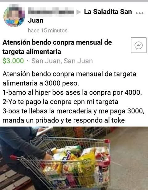 Indignación provocó la publicación de una mujer sanjuanina en un grupo de compra y venta de Facebook. Es que según ella misma publicó, vende la compra mensual de su tarjeta alimentaria para recibir el dinero en efectivo.