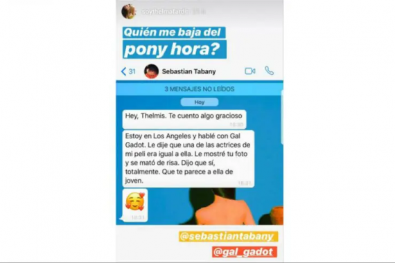 "¿Quién me baja del pony ahora?", dijo la actriz cuando publicó en su cuenta la captura de la conversación con Tabany. El director le dijo: "Hey Thelmis. Te cuento algo gracioso. Estoy en Los Ángeles y hablé con Gal Gadot. Le dije que una de las actrices de mi peli es igual a ella. Le mostré tu foto y se mató de risa. Dijo que sí, totalmente. Que te parecés a ella de joven".