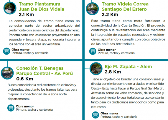 Plantamura-Juan de Dios Videla (2,1 kilómetros), Videla Correa-Santiago del Estero (2,2 kilómetros), Tiburcio Benegas-Parque Central-Avenida Perú (0,6 kilómetros) y Eje Martín Zapata-Alem (2,8 kilómetros).