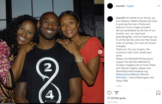 "En nombre de nuestra familia, nos unimos a Vanessa, Natalia, Bianka y Capri para lamentar la pérdida de Kobe y Gianna en un accidente tan trágico. Estamos devastados por la pérdida de nuestro hermano, hijo, nuestra sobrina y nieta, y nuestros corazones están con todas las familias que perdieron a sus seres queridos el domingo", escribió Sharia, haciendo extensible sus condolencias a los padres de Bryant, con los que el fallecido no se hablaba desde 2013.