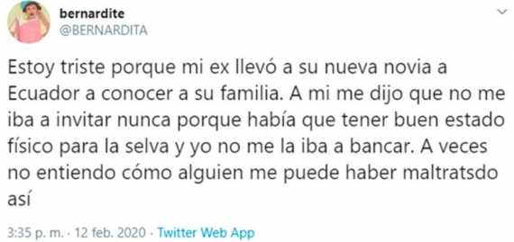 Todo comenzó cuando la usuaria @Bernardita contó a través de Twitter una mala experiencia que había tenido en el amor: "Estoy triste porque mi ex llevó a su nueva novia a Ecuador a conocer a su familia. A mí me dijo que no me iba a invitar nunca porque había que tener buen estado físico para la selva y yo no me la iba a bancar. A veces no entiendo cómo alguien me puede haber maltratado así", se quejó.