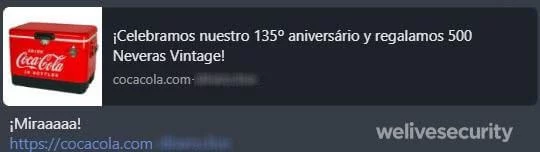 Una nueva campaña de suplantación de identidad (phishing) circula a través de un mensaje de WhatsApp con una tentadora oferta, vinculada a la marca Coca Cola. Su objetivo no es regalar heladeras vintage y televisores inteligentes sino invadir de publicidad no deseada los celulares de las víctimas.