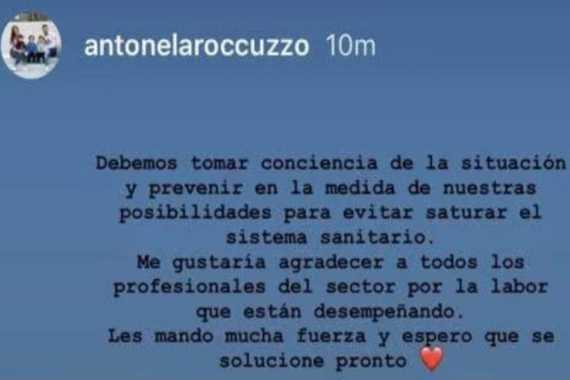 "Debemos tomar conciencia de la situación y prevenir en la medida de nuestras posibilidades para evitar saturar el sistema sanitario", sostuvo Roccuzzo. "Me gustaría agradecer a todos los profesionales del sector por la labor que están desempeñando. Les mando mucha fuerza y espero que se solucione pronto", sostuvo la pareja de Messi en un posteo en el que además agregó un vídeo de la doctora Maria Van Kerkhove , epidemióloga de la Organización Mundial de la Salud (OMS) .
