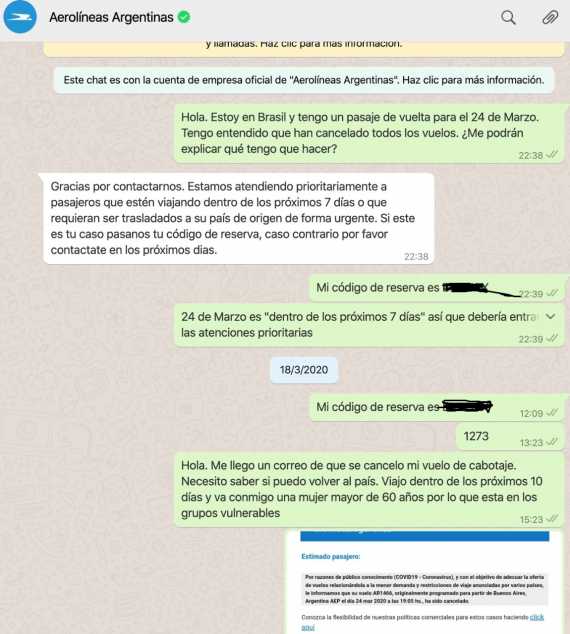 "Llenamos el formulario online. No me llegó ni un correo de confirmación. Yo no le tenía mucha fe, y me puse a ver contactos. Encontramos varios números de Cancillería y con la gente de recepción del hotel empezamos a llamar como locos. Al otro día llenamos el formulario de nuevo, con los datos de mi mamá. Mandamos mail a Cancillería. Encontramos tres WhatsApps para comunicarnos con Cancillería y escribimos a los 3. Uno de ellos me contestó diciendo que no se cancelaban los vuelos a Argentina, lo cual era claramente mentira, me dijeron que tenía que hablar con la aerolínea. En paralelo nos tratamos de comunicar con Aerolíneas Argentinas (no porque fuera la única que repatriaba en ese momento, sino porque en esa viajamos y teníamos el vuelo de vuelta. Había un 0810 para llamar, y un número de Whatsapp. El 0810 jamás nos atendió, en el Whatsapp, cuando vos le escribís te contesta un bot, diciendo que solo atienden a quienes tienen vuelo dentro de 10 días y aunque nosotros entrábamos en ese período, jamás contestó una persona humana. Cada 3 horas mandaba yo un mensaje a ver si me daban bola, y nunca jamás contestaron".