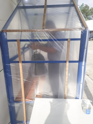 La cabina de desinfección es una estructura metálica de un metro de ancho y largo y de 2,10 metros de alto, cubierta con nailon y que en la parte superior tiene un pulverizador de un líquido desinfectante.