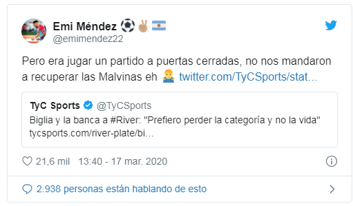 Y prosiguió: "Hay que ubicarse y ser responsable cuando se habla. No meter a todos en la misma bolsa porque no lo estamos". El propio Méndez había desatado la polémica cuando River no se quiso presentar ante Atlético Tucumán. En esa ocasión, el volante había escrito en Twitter "Pero era jugar un partido a puertas cerradas, no nos mandaron a recuperar las (Islas) Malvinas, eh".