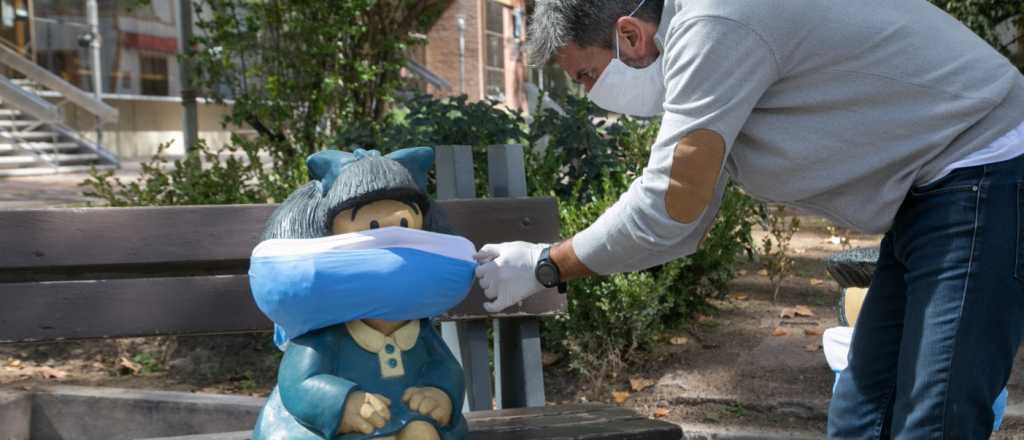 La escultura de Mafalda luce un tapabocas para recordar el uso obligatorio