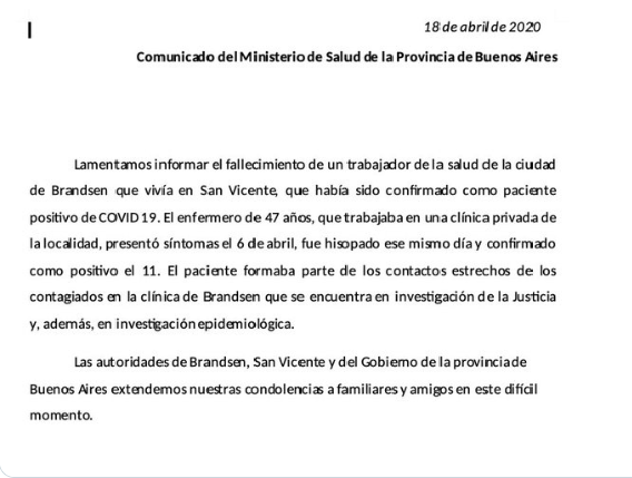 El hombre se encontraba internado desde el 7 de abril pasado en el Hospital Regional de la Cuenca Alta de Cañuelas y el 11 le diagonisticaron la infección con Covid-19. Enseguida el cuadro del enfermero, que sufría de hipertensión y obsesidad, se agravó y fue asistido con respirador mecánico. La información fue confirmada por el Municipio de San Vicente, que señaló que "la tragedia de la muerte del enfermero Silvio Cufré es un golpe muy fuerte para todos".