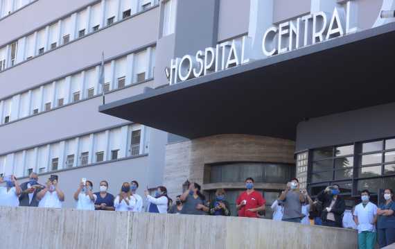 Bomberos y personal de la salud en el Hospital Central.