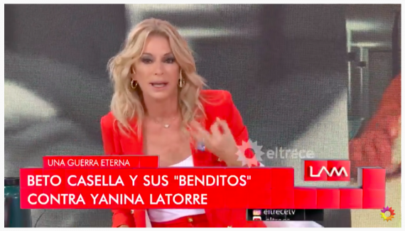 La furia de Latorre se desató cuando pasaron un fragmento de Bendita TV en el que Leto Casella hacia alusión irónicamente a la panelista al decir: "Probablemente Yanina Latorre no lo sabe porque ella debe tener un Instagram con millones de seguidores, pero hay un Instagram donde se ve la cara de Latorre, por ahí no lo sabe, y qué hay todos productos de la marca. Y hay un link que te lleva a una página que te da la bienvenida a ese nuevo mundo donde vas a ser millonaria. Avisenle qué hay alguien que usa su cara, porque quiero pensar que no conoce la cuenta", comento en tono sarcástico Casella, para así vincular a Latorre con la polémica forma de comercializar las "maquinitas estéticas" que utiliza la empresa que las vende acompañadas de cremas, que hoy está en el ojo de la tormenta en los medios de comunicación.