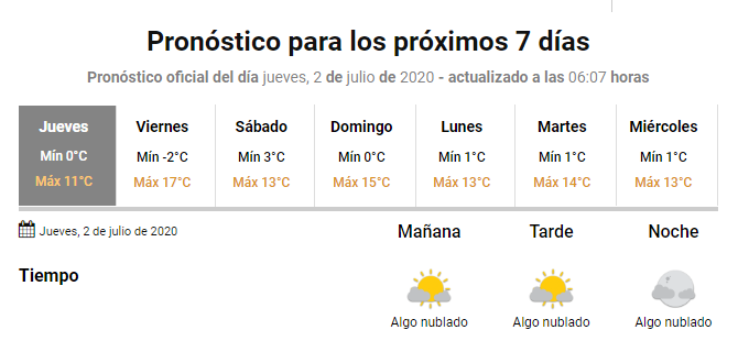 Para mañana viernes, el pronóstico indica cielo algo nublado y poco cambio de temperatura, con una máxima de 17º pero con una mínima de -2º.
