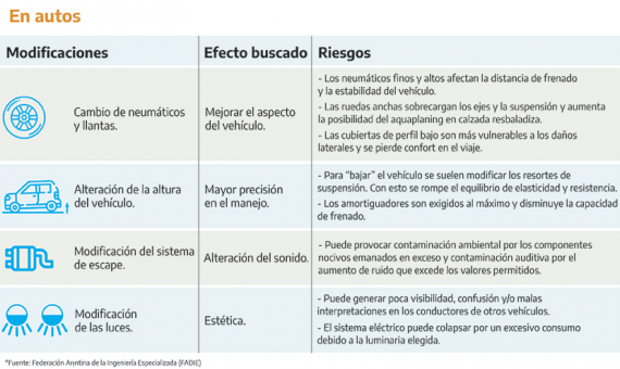 Sin embargo, la ANSV y la FADIE explican que realizar modificaciones por fuera de los márgenes naturales impuestos desde fábrica puede causar serios riesgos. Al alterar algún elemento de seguridad, el vehículo pierde las prestaciones de prevención para las que fue diseñado y no responde a las situaciones de peligro de manera efectiva.