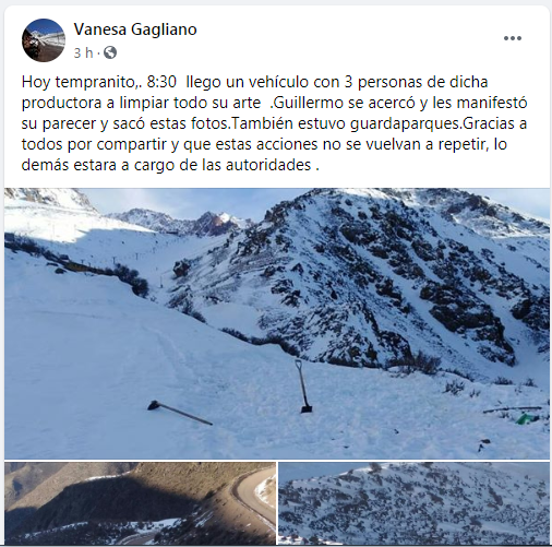 Por lo pronto, la misma usuaria que publicó la nieve pintada, ahora compartió desde su cuenta personal de Facebook que la zona ya había sido limpiada. Vanesa Gagliano escribió que "a las 8.30 llegó un vehículo con tres personas de dicha productora que limpió todo su arte".