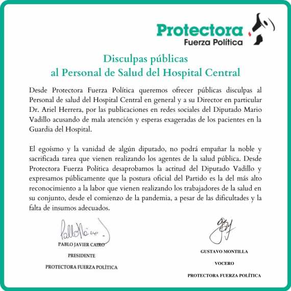 "Hacemos llegar nuestras más sinceras disculpas a todo el personal de salud del Hospital Central por los dichos del Diputado Mario Vadillo, que no representan el sentir de Protectora frente al arduo trabajo que se viene llevando adelante en este contexto", expresaron desde el bloque.