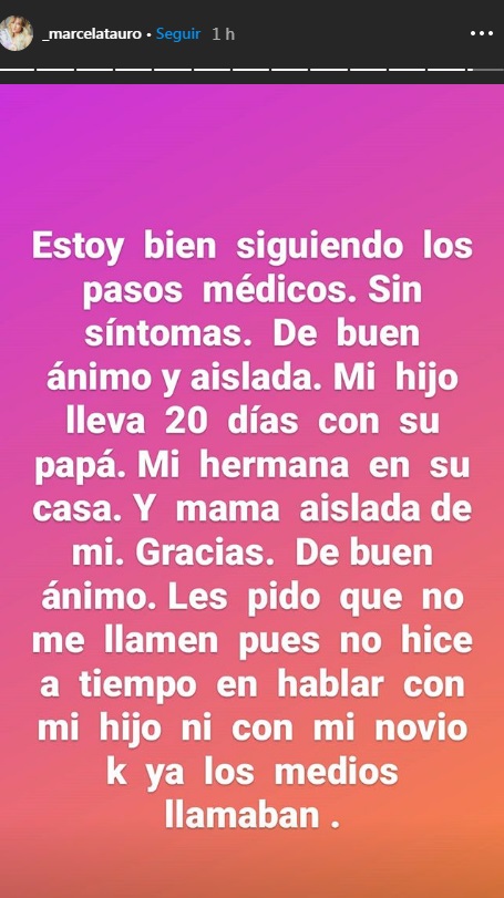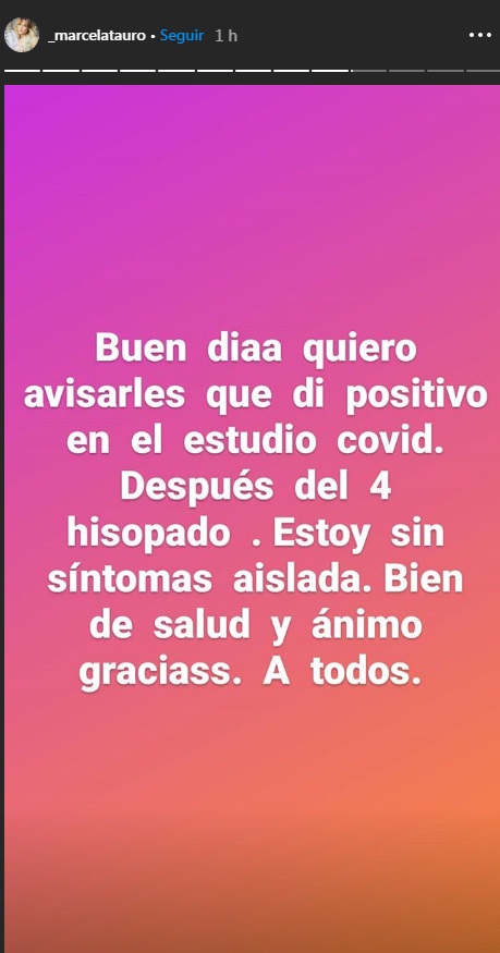 "Quiero avisarles que di positivo en el estudio de COVID, después del cuarto hisopado. Estoy sin síntomas, aislada. Bien de salud y ánimo", escribió Tauro en sus historias, agradeciendo además los mensajes recibidos por parte de sus seguidores.