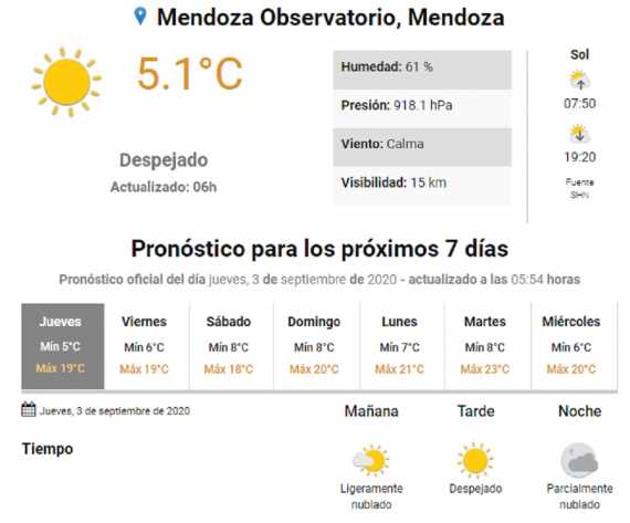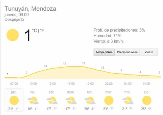 Para Tunuyán y los departamentos del Valle de Uco, el SMN pronostica cielo despejado con una máxima prevista de 21º y una mínima de 1º. Mañana se espera temperatura en ascenso con una máxima de 18º.
