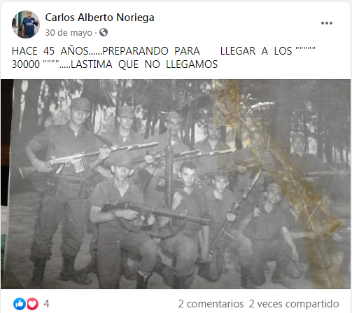 Además, investigan también una publicación en Facebook de Noriega que contiene una fotografía de un grupo de soldados, junto a un texto que expresa: "HACE 45 AÑOS...PREPARANDO PARA LLEGAR A LOS """"30000"""""....LASTIMA QUE NO LLEGAMOS", precedida de otra publicación cuyo texto expresa "CIA COMANDO A HORAS DEL PRIMER VIAJE A TUCUMAN.....MORTEROS 81 / 120 MM".