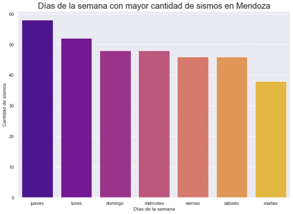 · El jueves es el día de la semana que más eventos sísmicos registra en Mendoza. El 17 por ciento de la totalidad de los sismos registrados en en nuestro territorio durante 2020 han sucedido ese día de la semana, lo siguen los lunes y domingo con 15 y 14 por ciento respectivamente.
