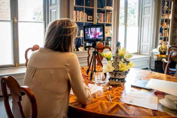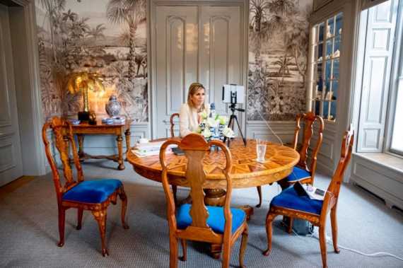 Muchas de las videollamadas, la Reina Máxima, las realiza a través de una tablet que coloca sobre un trípode así está más cómoda y tiene la pantalla a la altura de sus ojos.