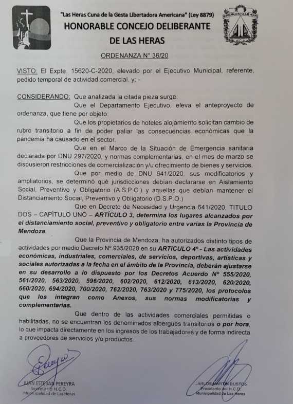 "A través de una ordenanza en el Municipio de Las Heras se ha concebido la habilitación a través de la figura de hoteles, que ya están funcionando desde este fin de semana pasado", explicó en declaraciones a la prensa el presidente de la Asociación de Albergues Transitorios de Mendoza, Eduardo Moyano.