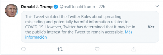 "En la mayoría de las poblaciones es mucho menos letal (que la influenza)", dijo sobre el Covid, en un argumento que provocó la reacción de las redes sociales en las que se publicó: Facebook lo eliminó y Twitter lo tapó con una advertencia de que incluía "información engañosa y potencialmente dañina sobre Covid-19", aunque permitía entrar a ver el mensaje a los usuarios que quisieran.