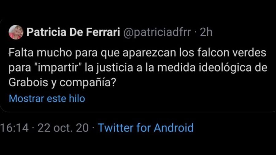 "Falta mucho para que aparezcan los falcon verdes para 'impartir' la justicia a la medida ideológica de Grabois y compañía", disparó Patricia de Ferrari, una diputada provincial de Córdoba que integra el espacio de Juntos por el Cambio. Posteriormente, la legisladora se arrepintió y borró ese tuit, aunque rápidamente se viralizaron las capturas de pantalla.
