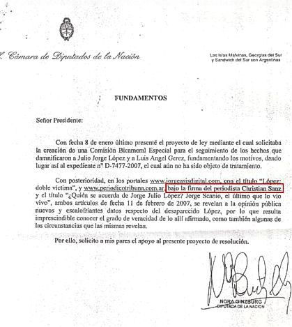 A la hora de fundamentar el pedido, Ginzburg asegura: "Con fecha 8 de enero último presenté el proyecto de ley mediante el cual solicitaba la creación de una Comisión Bicameral Especial para el seguimiento de los hechos que damnificaron a Julio Jorge López y a Luis Angel Gerez, fundamentando los motivos, dando lugar así al expediente n° D-7477-2007, el cual aún no ha sido objeto de tratamiento (...) Resulta imprescindible conocer el grado de veracidad de lo afirmado (por el periodista Christian Sanz), como también algunas de las circunstancias que las mismas revelan." Nuevamente el pedido durmió el sueño de los justos.