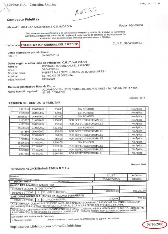Con el número a cuestas, pidió un informe a la empresa Fidelitas -una especie de Veraz- y allí observó con horror que el vehículo pertenecía a la "Contaduría General del Ejército" (Ver al pie). El miedo se apoderaba de su persona de manera elocuente. ¿Qué hacer frente a esto? Habló con su amigo Montenegro y con integrantes de su propia familia y llegó a la conclusión de que debía hacer la denuncia correspondiente.