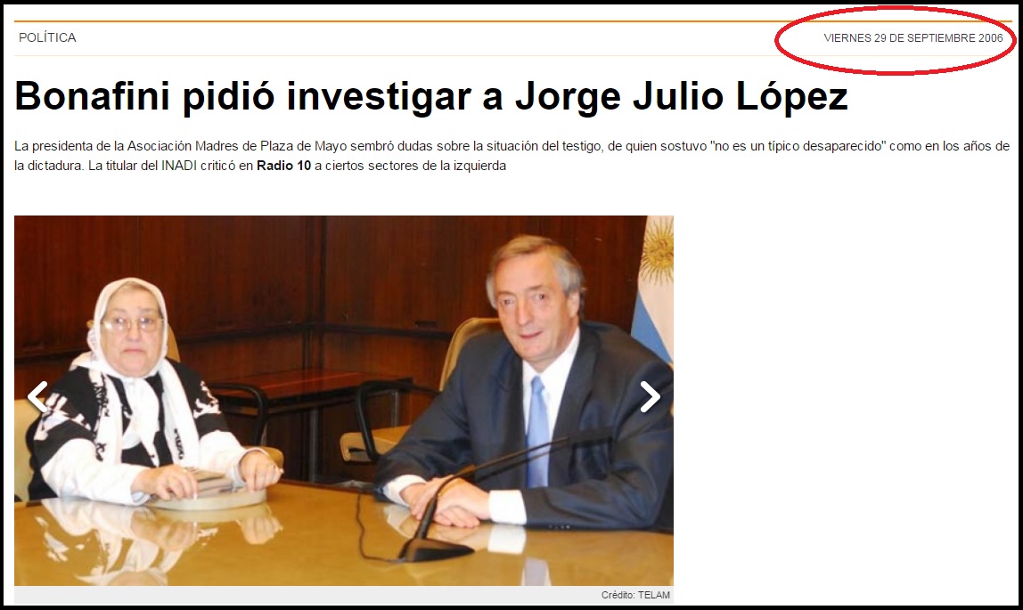 "Para nosotros, no es un típico desaparecido. López no fue militante, hay que investigar su trayectoria (...) vive en un barrio de policías, tiene un hermano policía y la familia no habla de que está desaparecido, lo cual es extraño", dijo Bonafini poco después de la evaporación del albañil, al salir de una reunión con el entonces presidente Néstor Kirchner en la Casa Rosada.