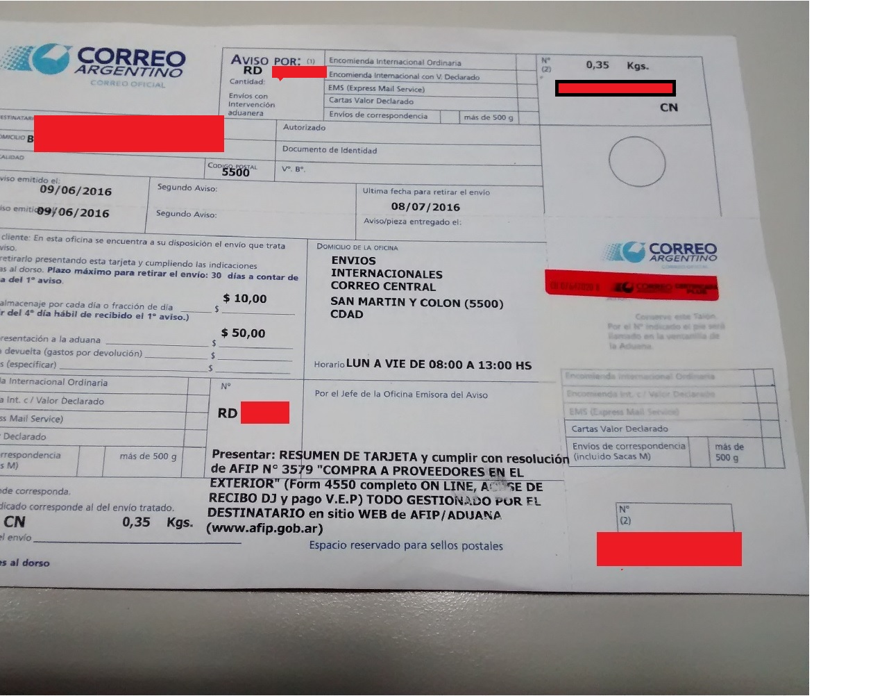 Sin haber superado los 25 dólares por la compra, la aduana argentina nos pide presentar los siguientes documentos: