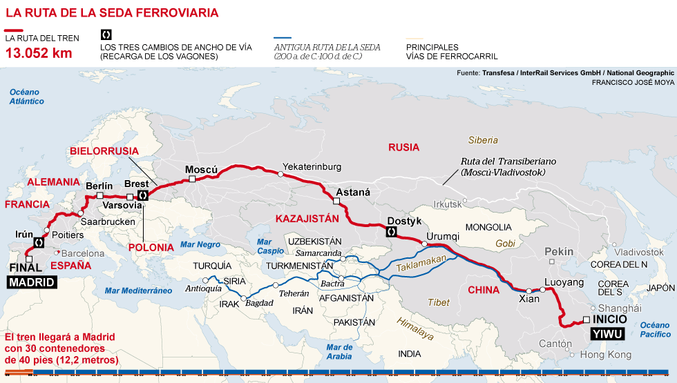 El "tren más largo del mundo" recorre más de 13.000 kilómetros y, en los 21 días que dura su viaje, atraviesa ocho países: China, Kazajistán, Rusia, Bielorrusia, Polonia, Alemania, Francia y España.