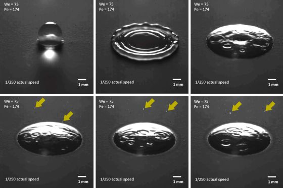 Capturando las gotas de lluvia en el momento del impacto con cámaras de alta velocidad descubrieron un mecanismo no visto antes: cuando una gota de agua golpea una superficie, comienza a aplanarse y simultáneamente comienzan a ascender pequeñas burbujas antes de estallar en el aire.