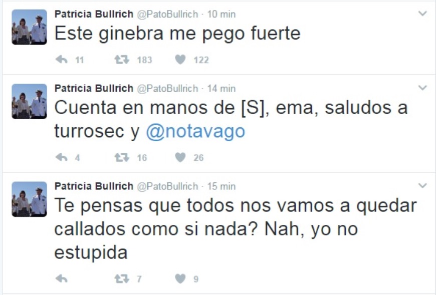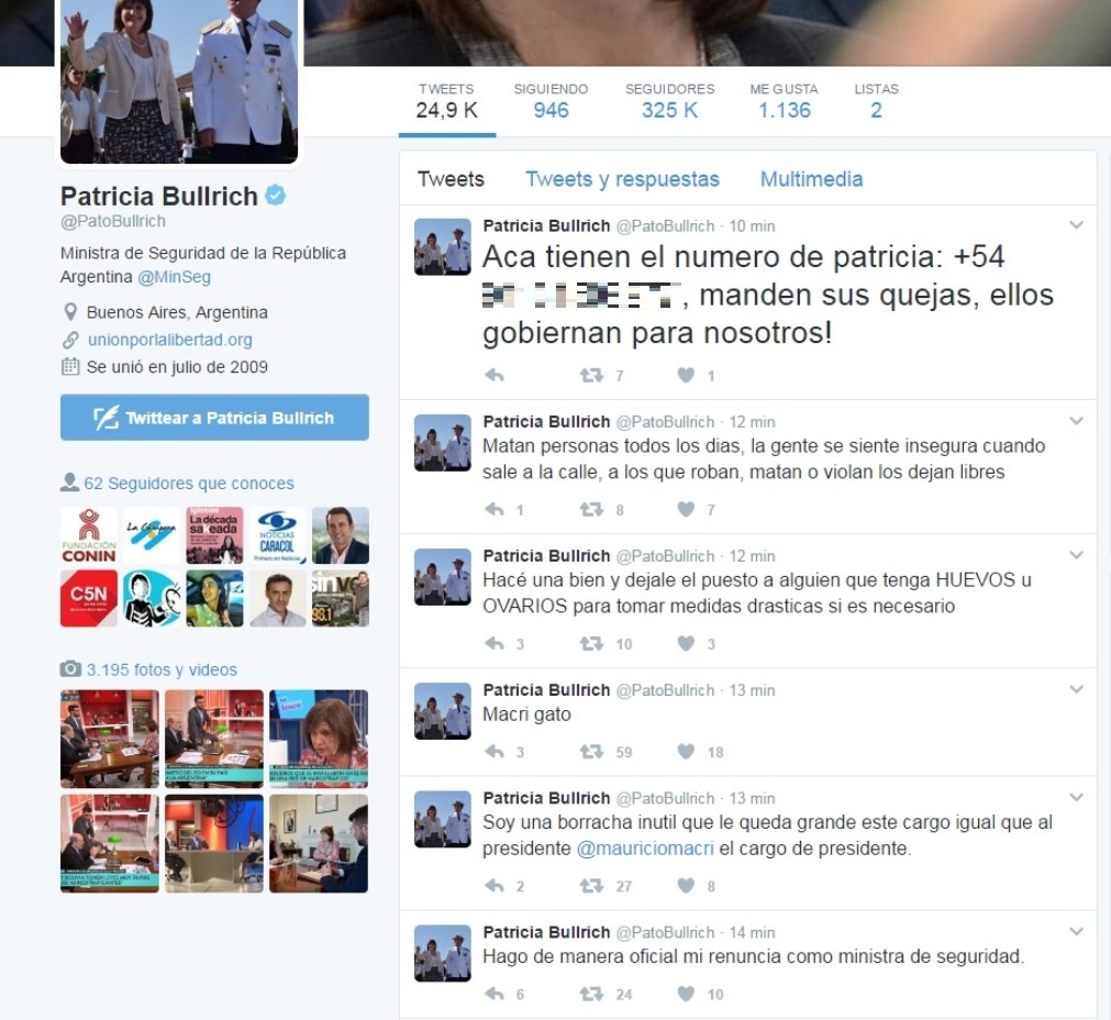 La alarma se despertó con el primer tuit que anunciaba la supuesta renuncia de Bullrich, sin embargo, minutos después se supo que se trataba de un hackeo con el mensaje: "Soy una borracha inutil que le queda grande este cargo igual que al presidente @mauriciomacri el cargo de presidente".