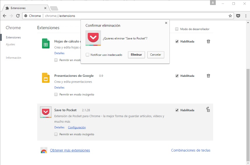 En la barra de direcciones podes introducir chrome://extensions y ahí podés deshabilitar las que no quieras. Es decir que podés desmarcar la caja para desactivarlas o seleccionar el icono de la papelera para eliminarlas.