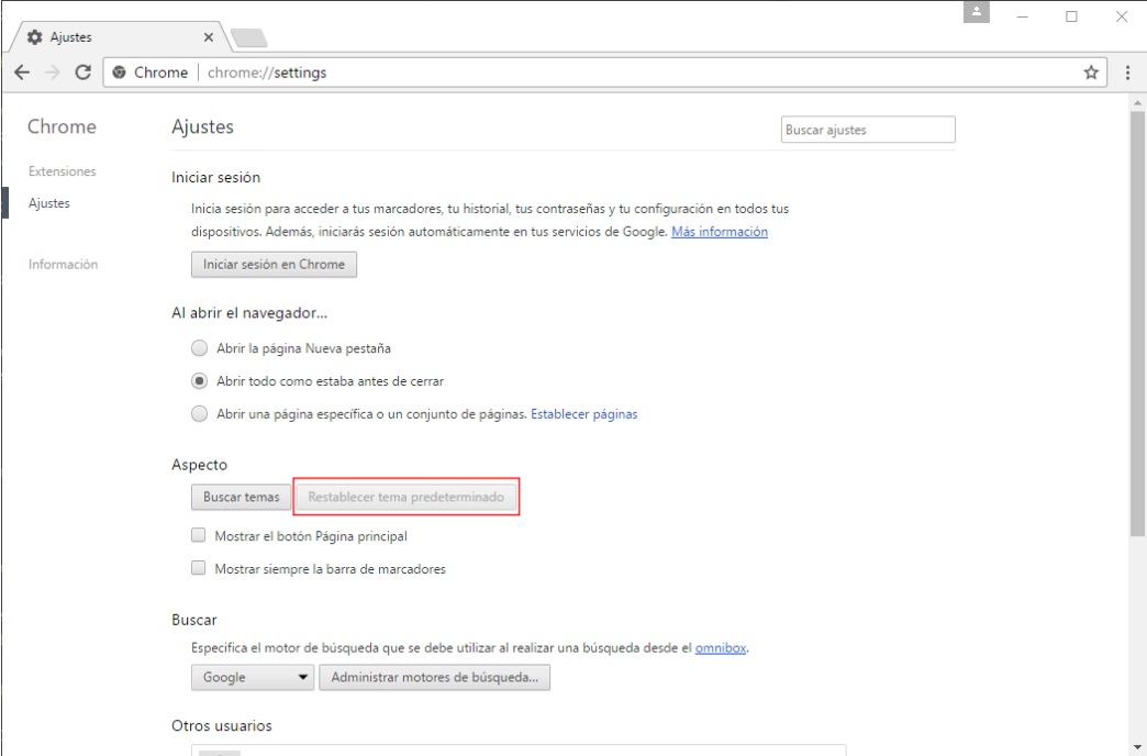 Escribe chrome://settings en la barra de dirección para entrar en las opciones, y pulsa el botón que aparece resaltado en la imagen si cambiaste la apariencia de Chrome para volver a la que tiene por defecto.