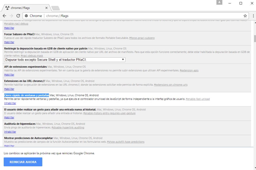 Escribe chrome://flags en la barra de dirección y en cuentra la opción "Cierre rápido de ventanas y pestañas". Esta opción "acelera" Chrome para que se cierren las ventanas independientemente de cualquier código JavaScript que pueda estar ejecutando.