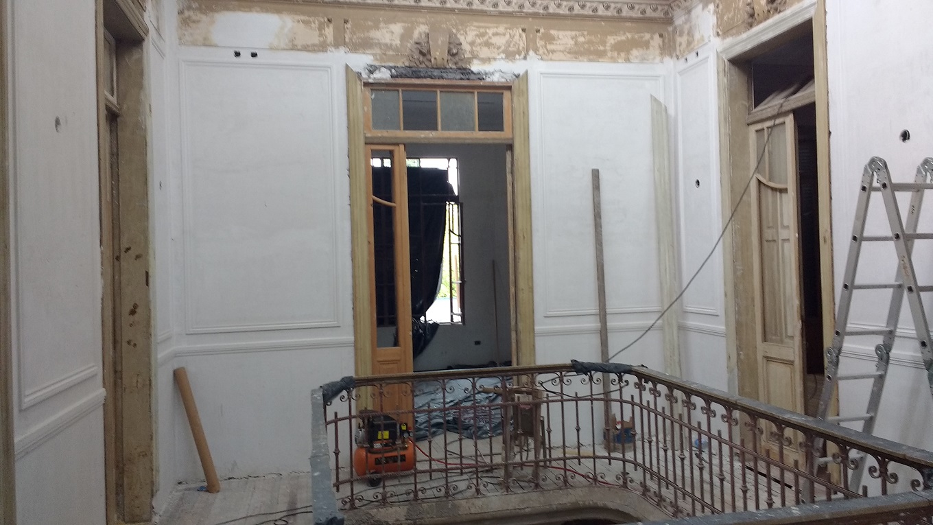 El segundo frente de trabajo es la mansión propiamente dicha. Tienen importantes avances las tareas de remodelación de molduras de techos, carpintería y herrajes, refuerzo estructural para adaptar la construcción a los códigos antisísmicos de la provincia y la recuperación y puesta en valor de los bienes y elementos de la casa, como las ornamentaciones, puertas, molduras, vitraux, escaleras y herrería.