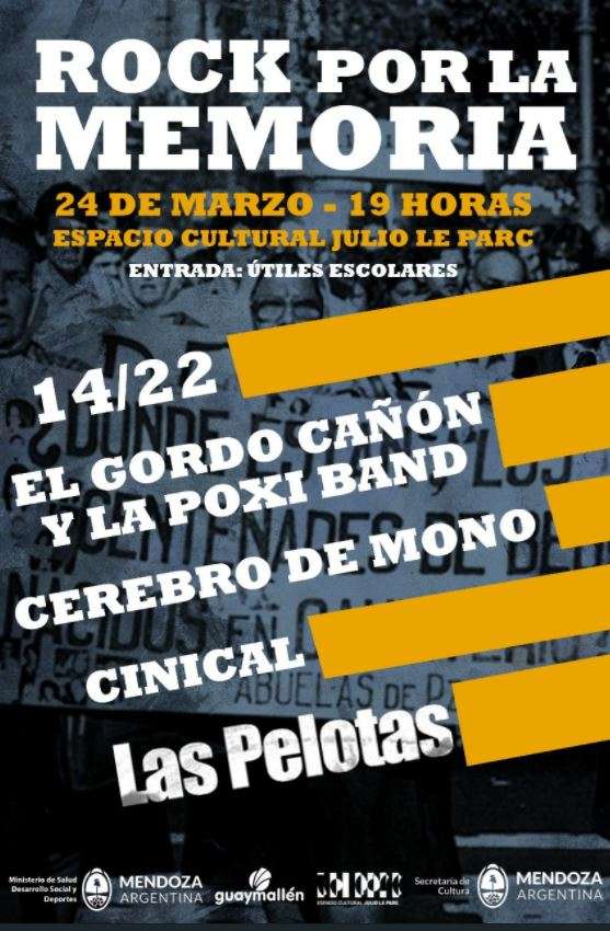 Por su parte, el gobierno de Mendoza organizó un festival llamado "Rock por la memoria" que comenzará a las 19 en el Espacio Cultural Julio Le Parc en el que tocará Las Pelotas. La entrada son útiles escolares.
