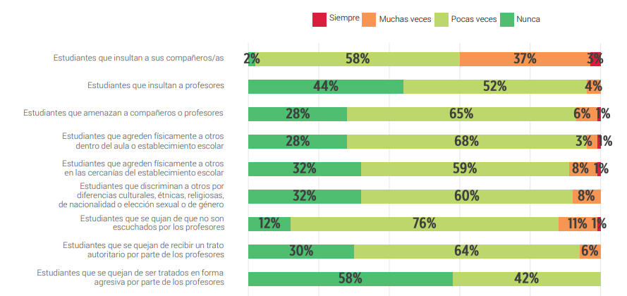 En este sentido, es preocupante la respuesta de los directores de escuelas secundarias mendocinas respecto del alto porcentaje de reclamos que reciben por parte de los alumnos en relación al trato de los docentes: el 88 % dice que no es escuchado por los profesores, y el 42 %, que son tratados en forma agresiva.
