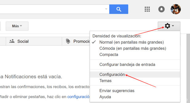 Para eso hay que ingresar en el panel de configuración de Gmail. Arriba a la derecha el icono de la rueda dentada, se puede encontrar la configuración. Al pulsar sobre, se abrirá un pequeño menú, y en ahí estará la opción Configuración.