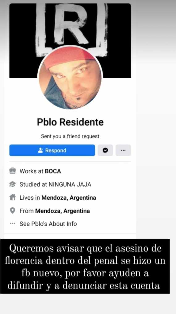 El perfil "Pblo Residente" fue el que levantó las sospechas de toda la familia de la joven asesinada. "Queremos avisar que el asesino de Florencia dentro del penal se hizo un FB nuevo, por favor ayuden a difundir y denunciar esta cuenta", afirman las publicaciones de los seres queridos de Florencia. El mismo, tras la viralización del caso, recibió tantas denuncias que ya no puede visualizarse.