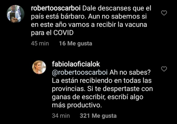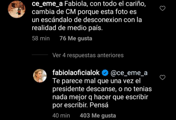 En este sentido, Fabiola no dudó en contestar algunos comentarios adversos y fue muy dura con las respuestas dadas. "Si te despertaste con ganas de escribir, escribí algo más productivo", "la salud y el descanso de dos días para el Presidente es más que importante", "¿te parece mal que una vez el Presidente descanse? ¿o no tenías nada mejor que hacer que escribir por escribir? Pensá", fueron alguna de sus respuestas que reprodujo Infobae.