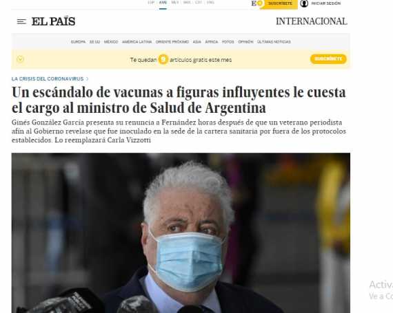 "Un escándalo de vacunas a figuras influyentes le cuesta el cargo al ministro de Salud de Argentina. Ginés González García presenta su renuncia a Fernández horas después de que un veterano periodista afín al Gobierno revelase que fue inoculado en la sede de la cartera sanitaria por fuera de los protocolos establecidos", publicó el diario El País de España.