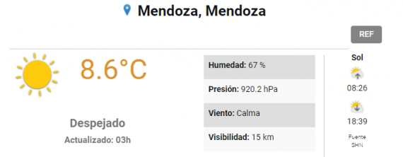 Para Tunuyán y los departamentos del Valle de Uco, el SMN prevé una jornada con viento del Oeste. El cielo permanecerá parcialmente nublado y la máxima está prevista en los 20º. Mañana se espera viento zonda con ráfagas algo fuertes desde la tarde, máxima de 19º y cielo con algunas nubes.