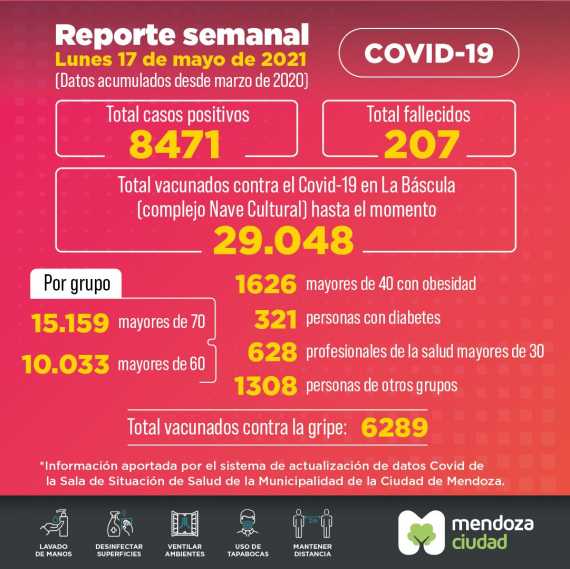 La Municipalidad de la Ciudad de Mendoza presenta el reporte semanal COVID-19 correspondiente al lunes 17 de mayo. El informe contiene datos sobre la situación epidemiológica en la comuna -cantidad de contagios y fallecimientos acumulados-. Asimismo, refleja la evolución de la campaña de vacunación que está desarrollándose en La Báscula, en el complejo de la Nave Cultural.