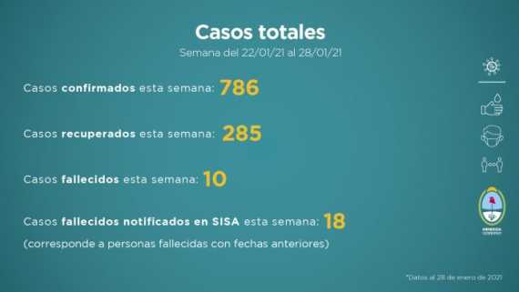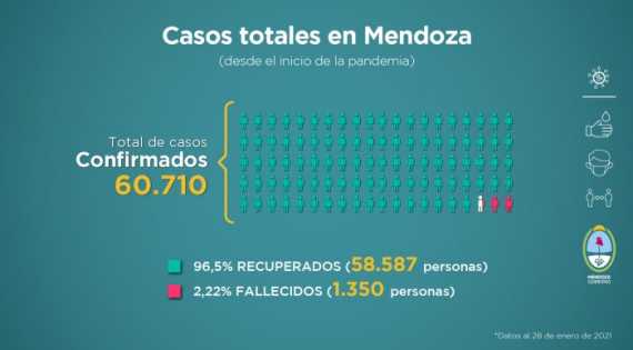 Los primeros datos que se desprenden desde que comenzó la pandemia en Mendoza son hasta anoche a las 21.30: 60.710 confirmados, 58.587 recuperados y 1.350 fallecidos. En cuanto a la cantidad de casos de Covid-19 en la semana del 22 al 28 de enero 2021, a las 21.30, es de 786 confirmados, 285 recuperados, 10 fallecidos y 18 casos fallecidos notificados en SISA esta semana (corresponde a personas fallecidas con fechas anteriores).