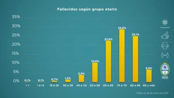 Asimismo, el grupo etario más vulnerable frente a la enfermedad sigue siendo el de los adultos mayores. El 76,5% de los fallecidos tiene entre 60 años y 89 años y las personas de más de 90 años representa el 6,8%.