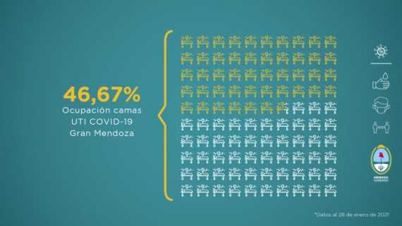 El Gobierno de Mendoza informó la situación sanitaria de la provincia, ante la pandemia de la Covid-19. Este nuevo reporte fue elaborado teniendo en cuenta distintas variables que se evalúan a la hora de tomar medidas en función del avance de la enfermedad. Esta entrega comprende datos recopilados de la semana del 22 al 28 de enero 2021: la ocupación de camas en el Gran Mendoza subió (44,6% a 46,67%), mientras que en todo el territorio provincial disminuyó (de 44,37% a 39,44%).