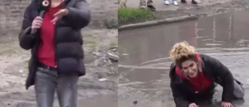 Todo parecía quedar en las denuncias y malestar por parte de los vecinos, pero mientras Salguero se acercaba a la cámara para mostrar otra de las partes de la mala infraestructura del lugar la cronista se cayó producto de un pozo tapado por agua y el momento quedó reflejado en vivo.