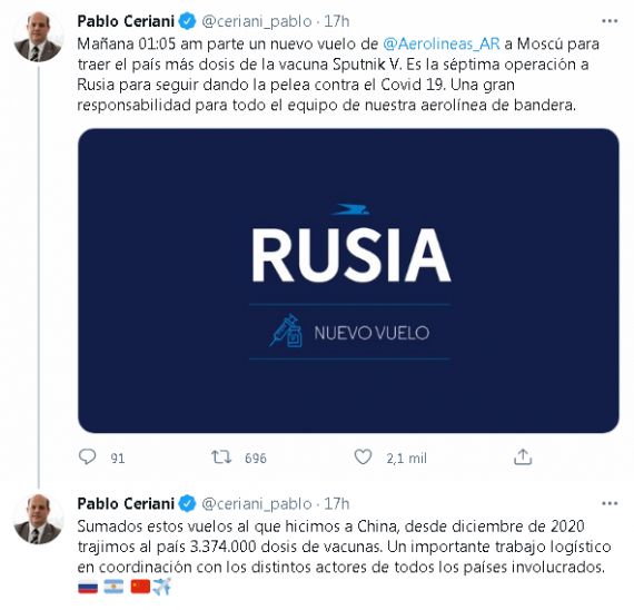 "Sumados estos vuelos al que hicimos a China, desde diciembre de 2020 trajimos al país 3.374.000 dosis de vacunas. Un importante trabajo logístico en coordinación con los distintos actores de todos los países involucrados", subrayó.